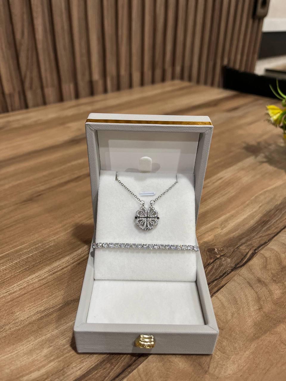 Collier b design lux , pour les filles li kaybghiw l'élégance w la féminité. Le pendentif kayjm3 bin métall argenté w pierre li kay3ti look classique w chik f nfs lwqt.